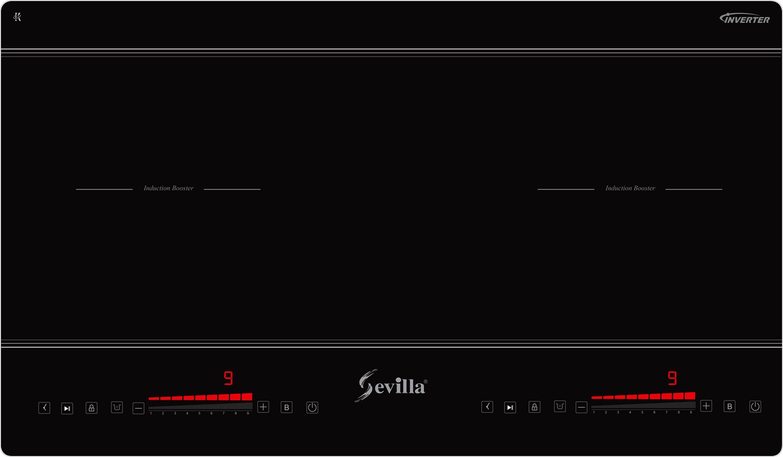 - Điều khiển cảm ứng trượt Slider Control 9 mức công suất, độc lập cho từng vùng nấu